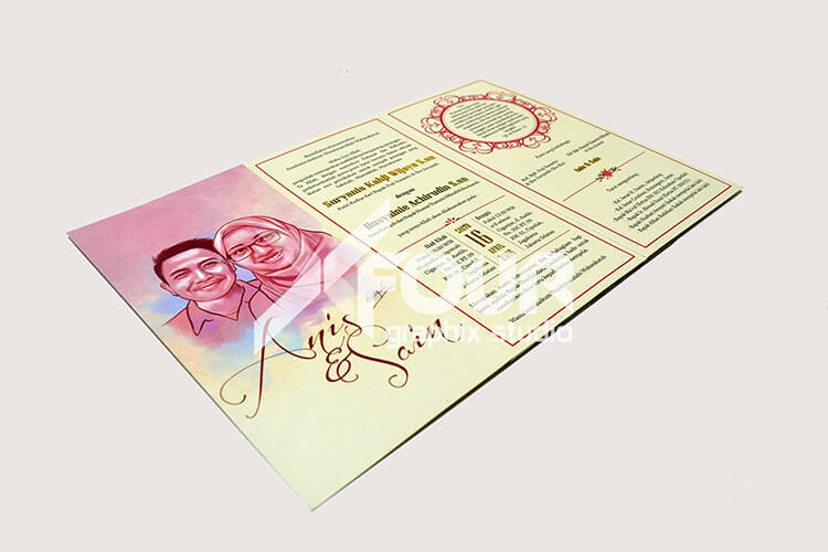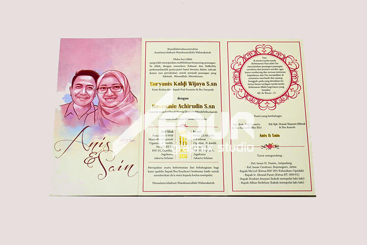 Undangan dengan gaya elegan dan modern ini cukup menarik perhatian, undangan ini dilapisi dengan hardcover yang menambah ke-eleganan undangan tersebut. Ditambah lagi dengan nama mempelai laki-laki dan perempuannya menggunakan poly berwarna emas, Apa warna poly untuk mempelai nya bisa diganti warna silver atau yang lainnya? tentu bisa, kaka tinggal informasikan warna seperti apa yang ingin dipakai untuk nama mempelainya. Mudah bukan?